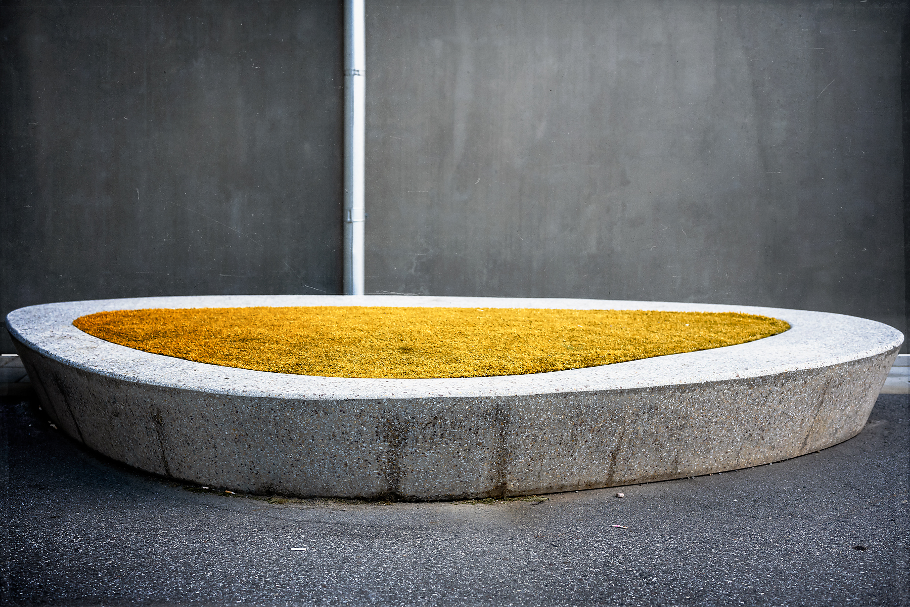Du, jag vet inte, gissar på något slags färgat konstgräs, kändes lite artificiellt, men det var just den kontrasten mot det grå som fångade mitt intresse. Objektet är ju en slags skulptural uppenbarelse, men eftersom jag inte hittade någon plakett med skaparens namn, så gissar jag att det bara är en del av arkitekturen, då hela byggnaden är i framkant rent formmässigt.